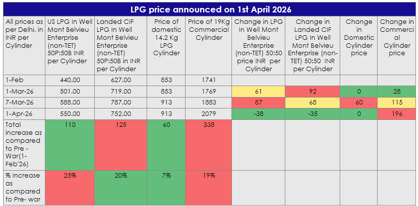 - International LPG benchmarks have also seen increases over the period, with Mont Belvieu prices rising by ₹110 (25%) and Landed CIF prices by ₹125 (20%) on 1st Apr'26 as compared to 1st Feb'26. However, the magnitude of increase in commercial LPG prices, particularly in absolute terms, remains notably higher than that of domestic cylinders.